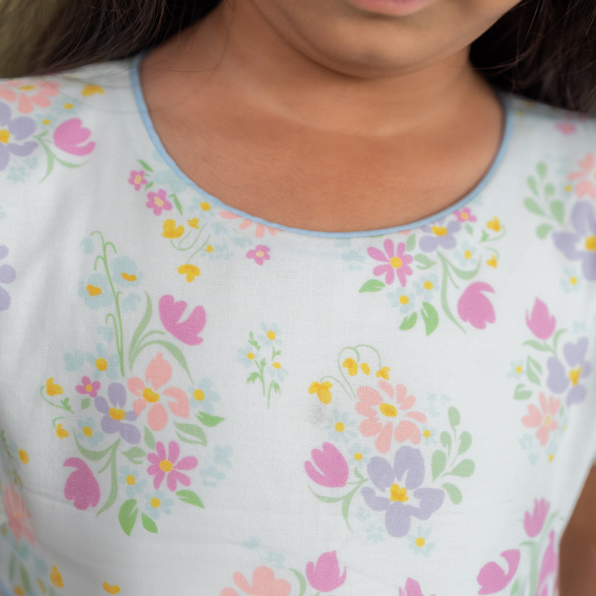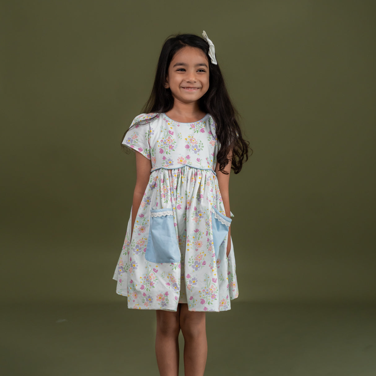 Soft pastel florals bring a cheerful charm to this kids dress for girls, making it a lovely pick for warm days. Designed with a scalloped waistline and contrast piping along the neckline and waist, the dress features a balloon-style skirt with handy pockets for little treasures. A girls summer party frock that works beautifully for special outings, playdates, and family gatherings.